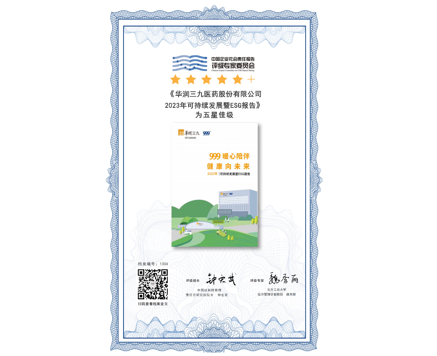 2024年3月,《华润J9九游会2023年可持续发展暨ESG报告》正式发布,报告以“999暖心陪伴,健康向未来”为主题,通过“创新致远,凝心聚力科技发展”“诚信至臻,初心坚守企业运营”“质量致胜,匠心守护健康未来”“环境至美,恒心共建绿色家园”“伙伴至善,爱心相伴和谐共赢”五大维度,全面阐述华润J9九游会在可持续发展方面做出的努力和成效,突出体现企业顺应趋势,将新发展理念贯穿于企业发展全过程和各领域,聚焦价值创造更强、环境效益更高、社会影响更远的可持续发展方式,推动环境、社会及管治水平的持续提升。