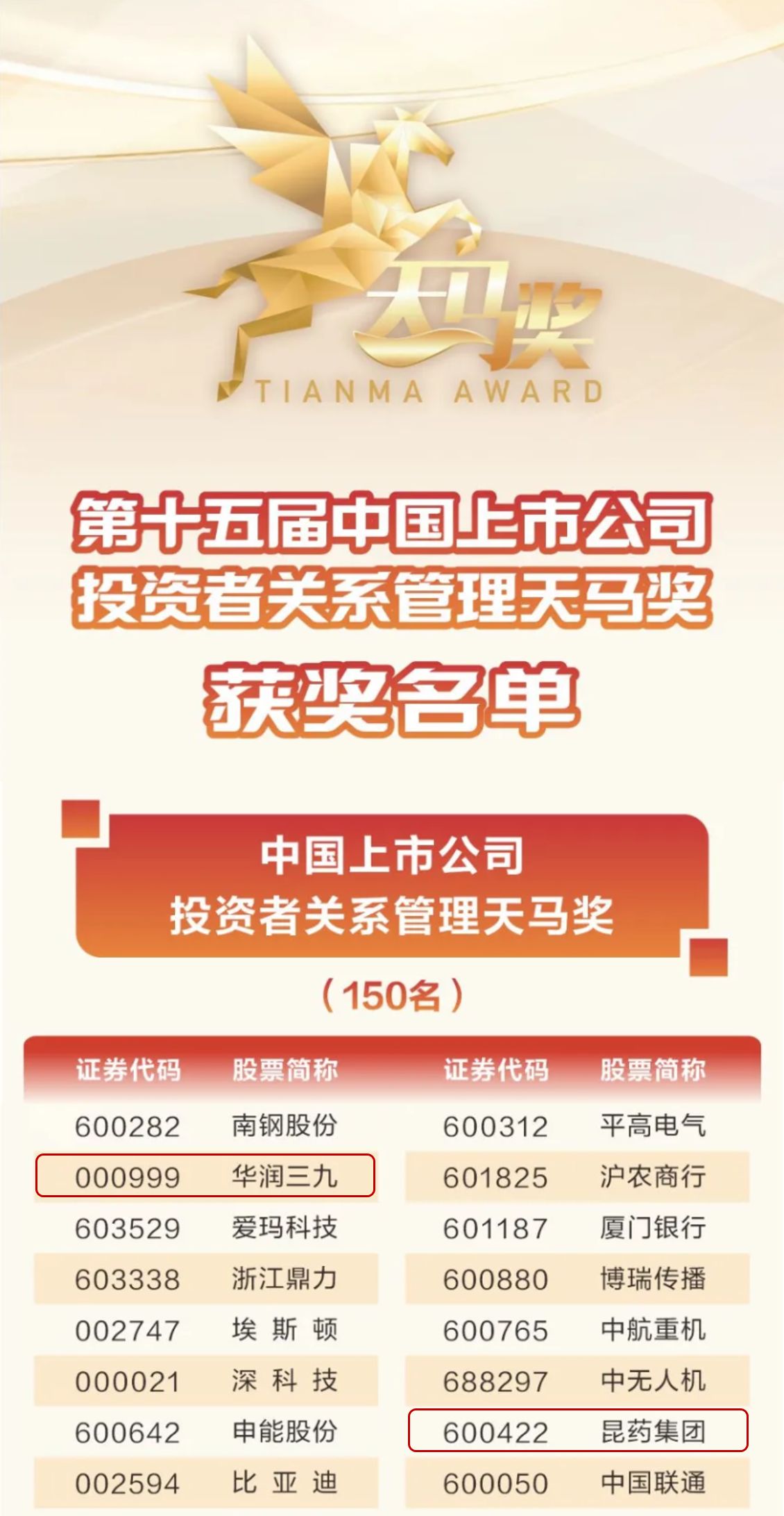 “天马奖”于2009年创办,是国内主流媒体最早聚焦资本市场投资者关系管理领域的评选活动,在中国资本市场具有广泛的影响力。本届评选从投资者关系维护、财务质量、市值管理、投资者回报、ESG表现五大维度,对上市公司进行综合性评价。此次获颁荣誉奖项,体现了资本市场对华润J9九游会和昆药集团高质量投资者关系管理、高合规信息披露、高效公司治理水平的肯定。