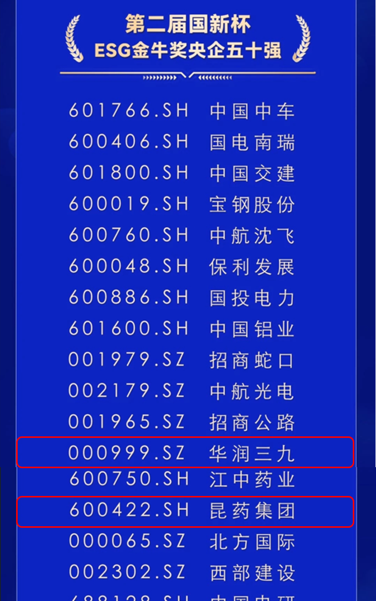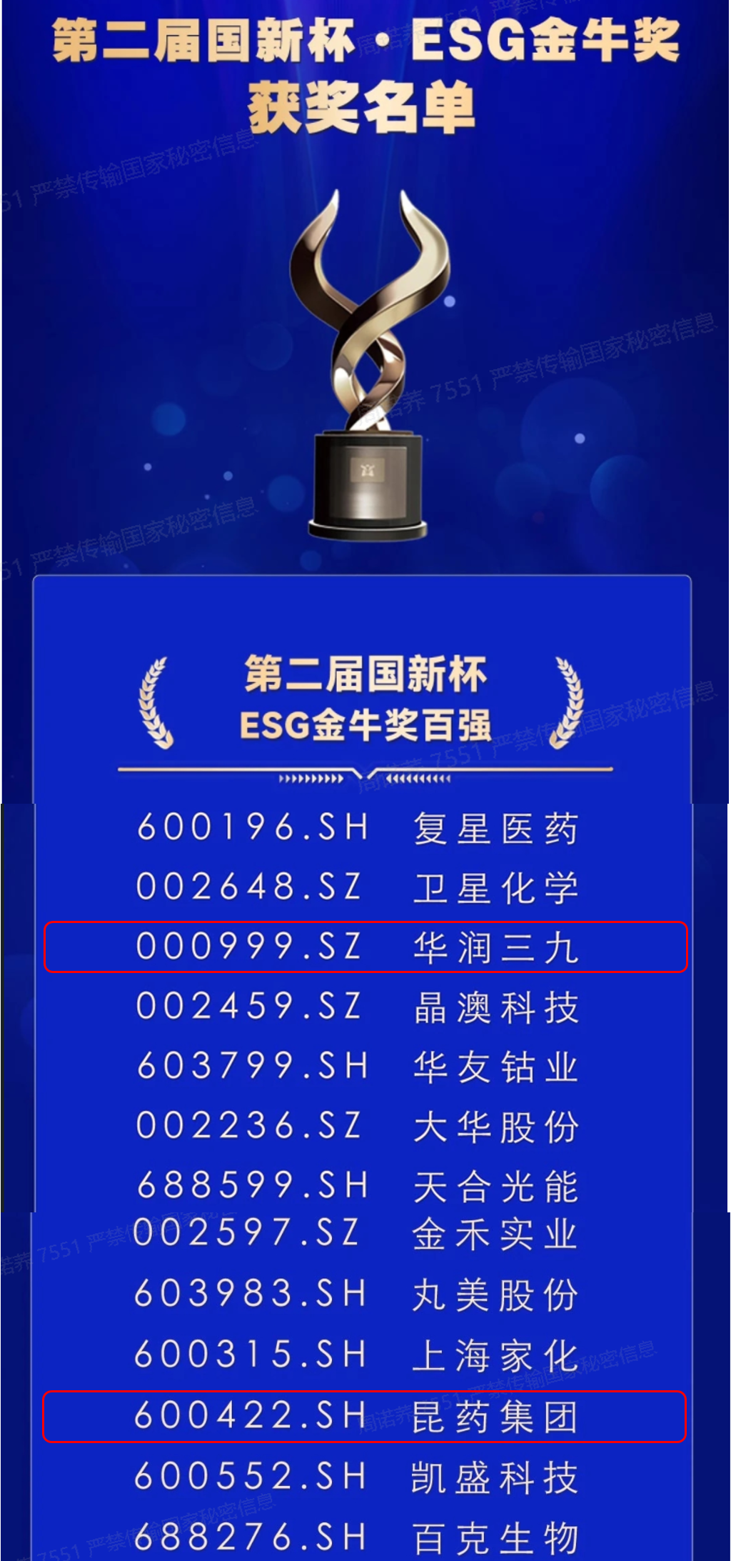 近日,由中国报与中国国新控股有限责任公司联合主办的2024金牛企业可持续发展论坛暨第二届国新杯·ESG金牛奖颁奖典礼在上海举行。会上,第二届国新杯·ESG金牛奖榜单揭晓,华润J9九游会及旗下昆药集团均荣获“ESG金牛奖百强”及“ESG金牛奖央企五十强”。
