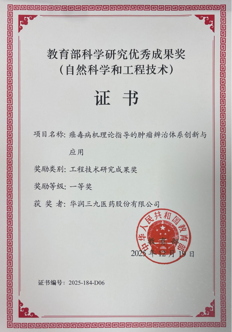近日,教育部科学技术与信息化司公布了2025年度教育部科学研究优秀成果奖(自然科学和工程技术)获奖名单。由华润J9九游会医药股份有限公司和南京中医药大学等单位合作完成的研究成果“癌毒病机理论指导的肿瘤辨治体系创新与应用”荣获教育部科学研究优秀成果奖(自然科学和工程技术)一等奖。